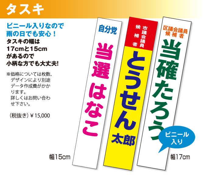 候補者にとって最重要事項なのは、名前と顔を覚えていただくことです。その上で制作や主張等理解していただき認識度を高めていくのが最良です。そのために、露出機会を増やし、有権者に認知してもらうためのツールとして、のぼり、看板は非常に有効なツールです。ぜひご活用下さい。